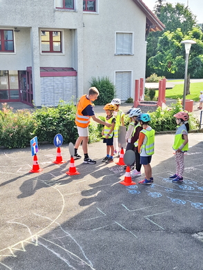 Die Eltern wurden in einem einstündigen Theorieteil auf den aktuellsten Stand der Verkehrs- und Verhaltensregeln gebracht, während die Kinder ihre Fahrkenntnisse in einem Postenlauf unter Beweis stellen konnten und die Verkehrsregeln, das korrekte Abbiegen und das Zeichengeben gelernt haben. In der Pause konnten sich alle Teilnehmer*innen mit Getränken, Kaffee, Zopf und Kuchen stärken. Anschliessend wurden die Kinder in drei Gruppen eingeteilt und durften das Dorf erkunden. Das Highlight der Kinder war das Überqueren der Kantonsstrasse durch den Kreisel. Einige hatten grossen Respekt, aber Mithilfe vom Erlernten und der tollen Instruktion der Kursleiter hat jedes Kind diese Herausforderung bestens gemeistert.