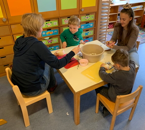 Andere Kindergarten- und Schulklassen bekamen Besuch von ihrer "Götti-Gotti-Klasse". Die Kindergarten- und Schulkinder bekamen so tatkräftige Unterstützung von den älteren Schülerinnen und Schülern beim Schnitzen ihrer Räbeliechtli. Immer wieder helfen die "Götti-Gotti-Klassen" den Jüngeren, was ein sehr tolles Projekt von der Schule ist. Die Kinder lernen Verantwortung zu übernehmen, eigenständig zu werden und einander zu unterstützen.
