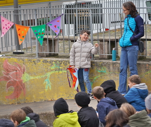 Nach den Liedern wurden dem Schulleiter Peter Wiedemeier und der Schulleiterin Silvia Holenstein vier farbige Wimpel für ihr Büro überreicht, damit sie im grauen Arbeitsalltag von Farbe begleitet werden. Zusätzlich erhielt die Schulleiterin Frau Holenstein eine lange Wimpelkette, die sie im Schulhaus Ifängli im Unterdorf anbringen darf. So bekommen die Schulhäuser in Ehrendingen eine farbliche Verbindung.