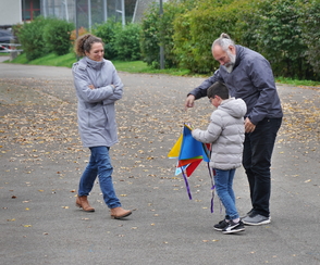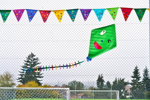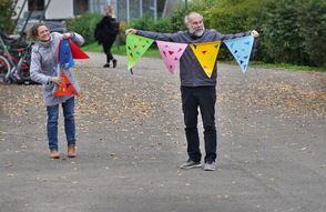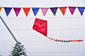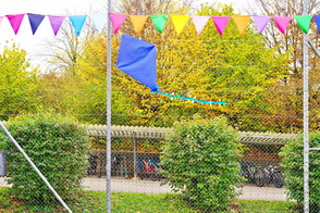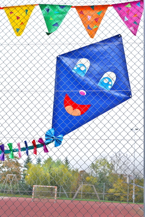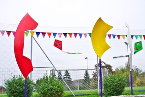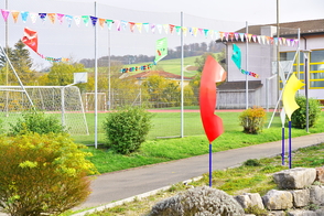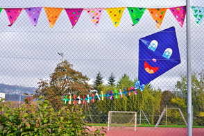 Da der neblige Herbst nun eingezogen ist, bringen die farbenfrohen Wimpel und zusätzlich fünf bunte Drachen Farbe in diese Jahreszeit. Dies wird vermutlich die letzte Dekoration dieser Art sein, bevor die geplante Dreifachturnhalle hoffentlich realisiert wird.