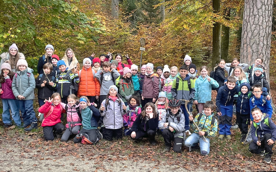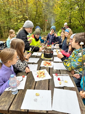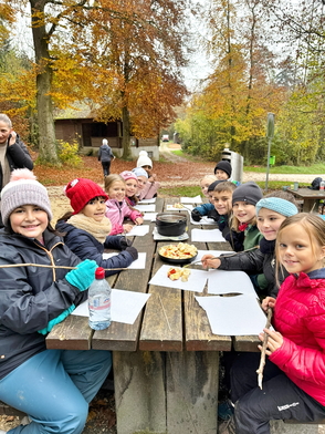 Am Mittwochmorgen haben sich alle drei 4. Klassen zu einem gemeinsamen Ausflug in den herbstlichen Schladwald aufgemacht. Zum Abschluss unseres spannenden Unterrichtsthemas „Zucker“ erwartete die Schülerinnen und Schüler dort eine süsse Überraschung: Ein Schoggi-Fondue!