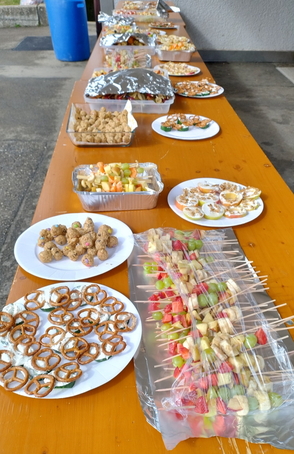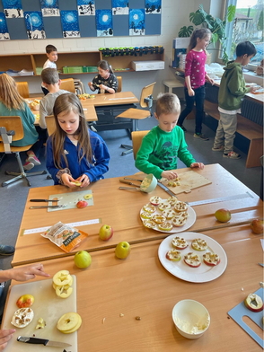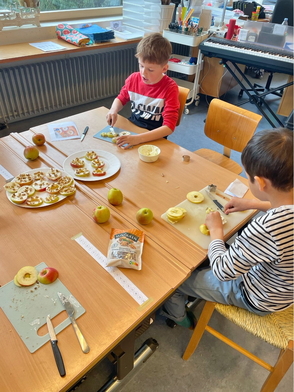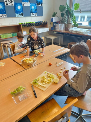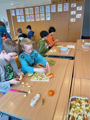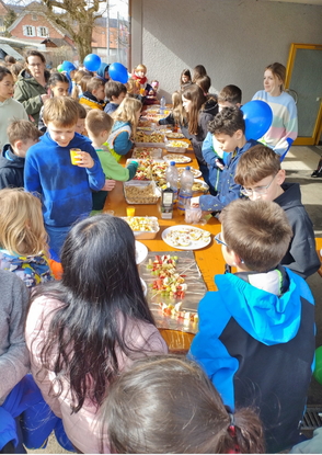 Am Nachmittag trafen sich alle Kinder vom Ober- und Unterdorf auf dem roten Platz im Oberdorf. Wir sangen gemeinsam «Alli zäme», unseren Schulsong. Ein beeindruckendes Drohnenfoto hielt diesen besonderen Moment fest. Danach ging es zum Buffet mit gesunden Leckereien: Frucht- und Gemüsespiesse, Energiebällchen, Knäckebrot und frische Säfte – für jeden war etwas dabei!