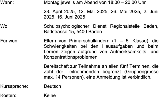 In diesem interaktiven Gruppenkurs lernen Sie theoretische Grundlagen zu den Themen Lernen, Konzentration und Motivation kennen und erhalten wertvolle praktische Hinweise sowie konkrete Übungen, die Sie mit Ihren Kindern anwenden können. Im persönlichen Austausch mit anderen Eltern teilen Sie Ihre Erfahrungen und erarbeiten gemeinsam hilfreiche Strategien.